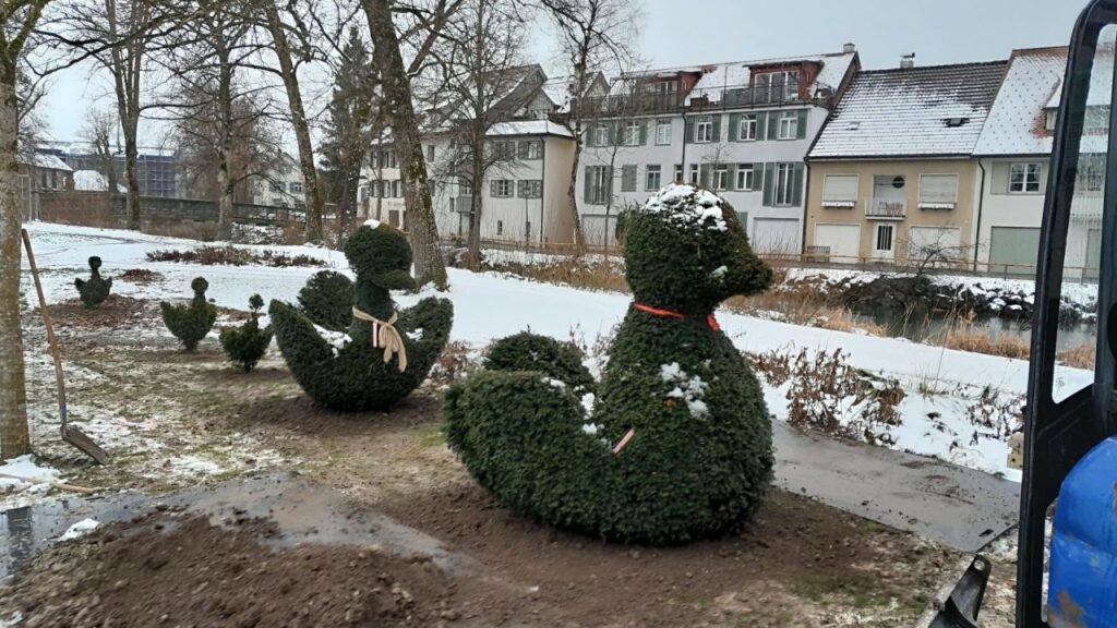Zur Ergänzung der bereits vorhandenen Bronzefigur "Hochwasserente" (zur Erinnerung an das Pfingsthochwasser von 1999) wurden Formgehölze (Taxus baccata) in Entenform gepflanzt.